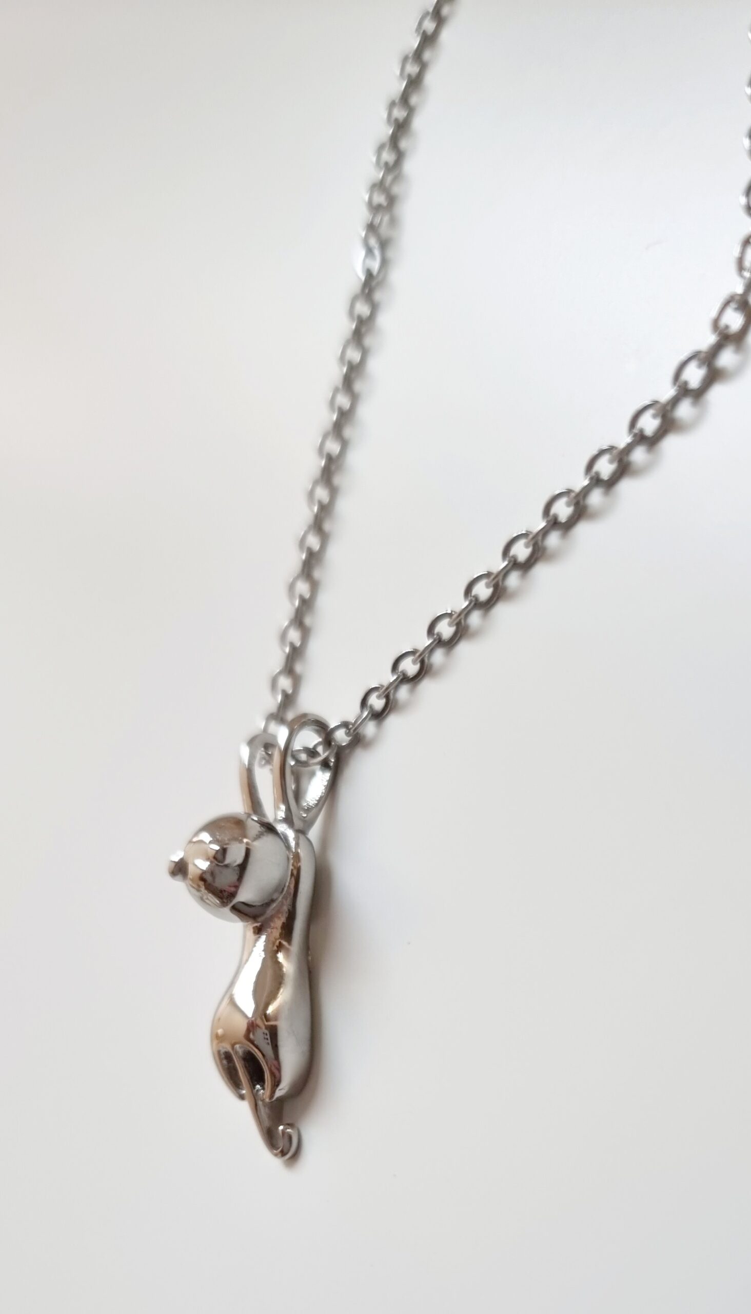 Ashanger kat zilver rvs, een hanger waar je een symbolische hoeveelheid as in kan plaatsen. De schroefdop is fraai weggewerkt aan de onderzijde van de hanger.